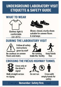 Access to the Laboratoire Souterrain de Modane (LSM), located within the Fréjus Tunnel, is subject to strict safety and administrative procedures due to its location and the nature of the research conducted. Visits, whether scientific, educational, or institutional, must be planned in advance and approved by LSM management.